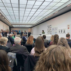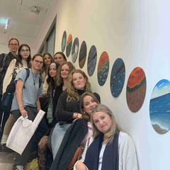 Als Höhepunkt der Exkursion ging es dann in die Galerie im Kunstgebäude am Schlossplatz, in dem die SCHULKUNST-Landesausstellung stimmungsvoll eröffnet wurde. Das baden-württembergische SCHULKUNST-Programm präsentiert im Jahr seines 40-jährigen Jubiläums eine große Landesausstellung zum Thema „Serie“ mit einer exklusiven Auswahl künstlerischer Arbeiten von Schülerinnen und Schülern. Der Kunst Leistungskurs der K2 war hier mit eigenen Malereien zum Thema „Wetterphänomen“ beteiligt. Die Schülerarbeiten wurden bereits in der vorausgegangenen regionalen SCHULKUNST-Ausstellung, die vor einiger Zeit in Tuttlingen stattfand, gezeigt und die eindrucksvollsten Werke wurden ausgewählt, um in Stuttgart nun in einem noch größeren Rahmen gewürdigt zu werden. Die Ausstellung wurde feierlich von Prof. Dr. Christiane Lange, Direktorin der Staatsgalerie Stuttgart eröffnet, gefolgt von lobenden Grußworten von Theresa Schopper, Ministerin für Kultus, Jugend und Sport und Prof. Dr. Thomas Riecke-Baulecke, Präsident des ZSL, Zentrum für Schulqualität und Lehrerbildung. Musikalisch wurde der Nachmittag durch Beethovens Klaviersonate und einer Eigenkomposition, beides von Eric Bäuerle, Klasse 7, Realschule Burladingen, am weißen Flügel begleitet. Nach einer informativen Einführung in die Ausstellung durch Anna Arnold, Referentin der Kunstvermittlung in der Staatsgalerie, ging es, begleitet von der Schüler-Jazz-Combo des Gymnasiums Plochingen in den Ausstellungsteil ins Haus der Katholischen Kirche. Hier konnten die Schülerinnen beim lockeren Stehempfang ihre und andere Schülerarbeiten der breiten Öffentlichkeit präsentieren und darüber plaudern. Fröhlich von den Eindrücken ging es für alle dann zurück an den Bodensee.